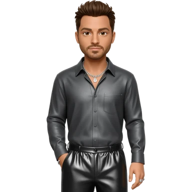 Ricky Martin with brown hair, dark gray metallic long sleeve shirt, black metallic baggy pants, silver necklace emoji