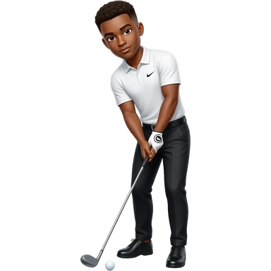 black skinned 22 year old man with a brown low taper fade black golfing pants, black golfing shoes, white nike golf shirt where it is so tight you can see his abs, wearing a diamond chain with nothing around the chain just singular chain also swinging the golf ball with the club emoji