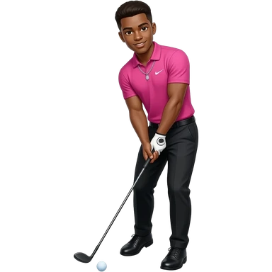 black skinned 22 year old man with a brown low taper fade black golfing pants, black golfing shoes, pink nike golf shirt where it is so tight you can see his abs, wearing a diamond chain with nothing around the chain just singular chain also swinging the golf ball with the club emoji