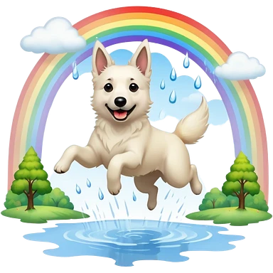 White belgian Shepard jumping over Rain puddles. There is a rainbow in the sky emoji