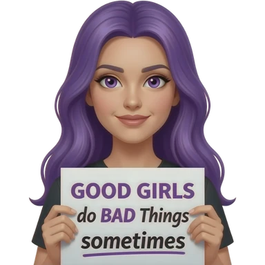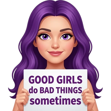 sexy girl with long purple hair and purple eyes holding a GOOD GIRLS do BAD THINGS sometimes sign emoji