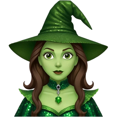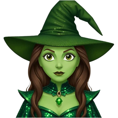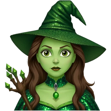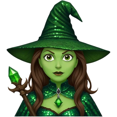 Wicked Witch of the West from the Wizard of Oz with long brown hair, dark green sequin outfit, green skin emoji
