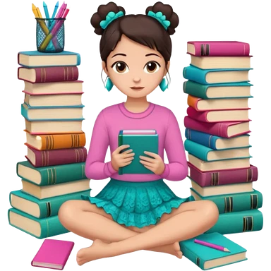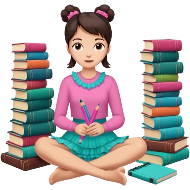 A brunette woman with straight, dark brown hair styled in two buns wears a pink long-sleeved shirt and a turquoise lace ruffled skirt. She is barefoot and holds a crayon in one hand. She sits cross-legged on the floor, which is covered with stacks of colorful notebooks. Art Deco style illustration. emoji