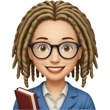 Google search character with librarian hairstyle and glasses, surrounded by books, apple emoji style