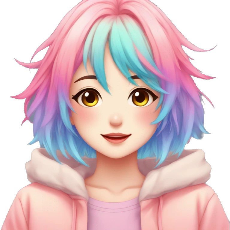 Gorgeous anime style shojo character with blushing face aesthetic and pretty colorful shiny gradient neon hair with hair garment trending style emoji | AI Emoji Generator