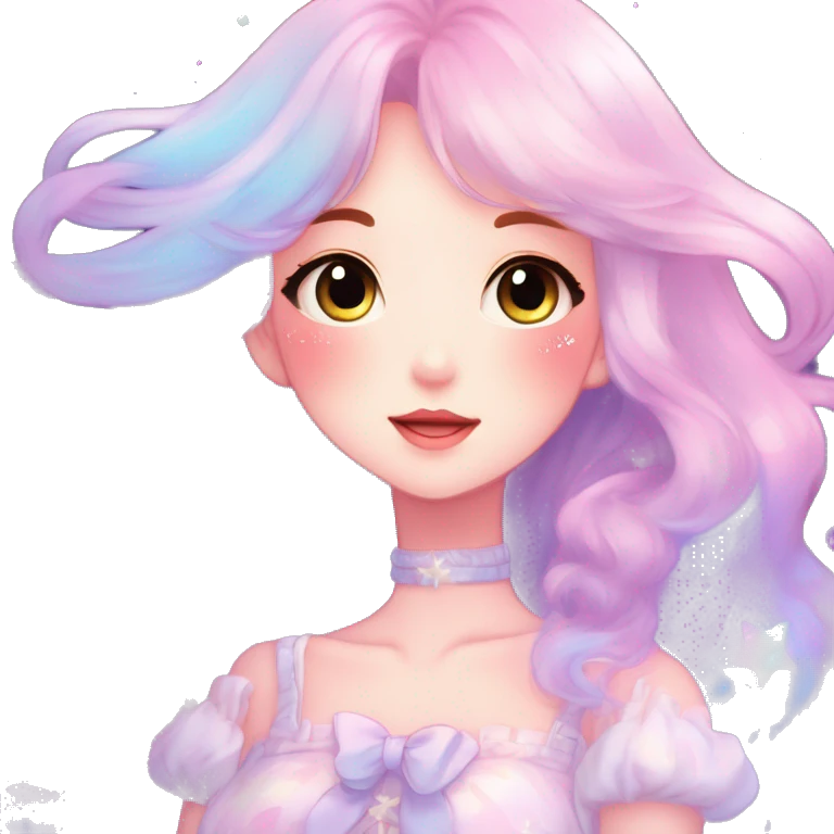 Gorgeous pastel anime style lady blushing nebula gradient sparkle face dreamy idol model colorful shiny stars galaxy kawaii cottagecore pearly petite simplistic aesthetic trending style emoji | AI Emoji Generator