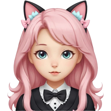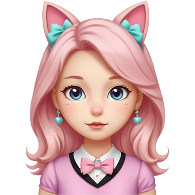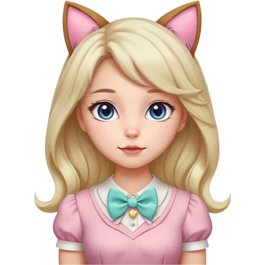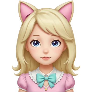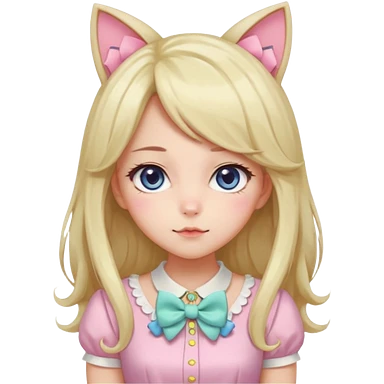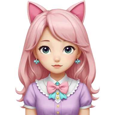 Gorgeous spectacular epic realistic mature anime-styled smooth soft shiny romantic pastel anime style lady with blushing cheeks, cat ears, long beautiful luscious stylish hair, big pretty eyes, dark-brown hair, colorful pastel Lolita dress, necklaces, jewelsemoji