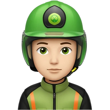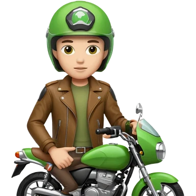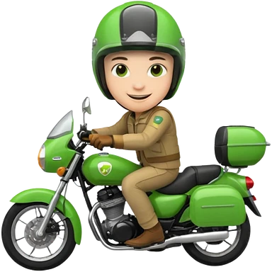 ojek online driver, using motorbike, the helmet is green. green jacket, not green motorbike (maybe a black jacket with green stripes just a little) then please make the driver not looking at "camera", emoji
