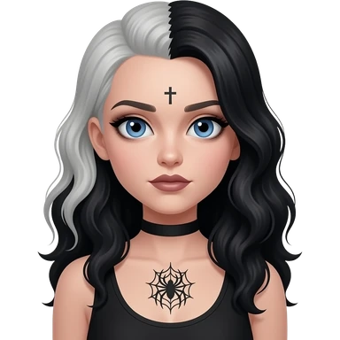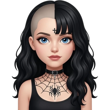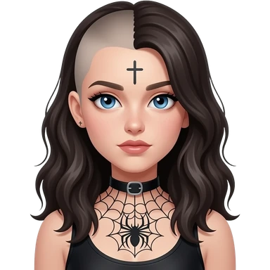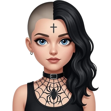 Goth girl with half of her hair shaved, the unshaved part is really long and wavy and blue eyes she has a spiderw3d tattoo on her chest and a small cross tattoo on her temper emoji