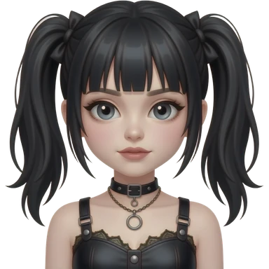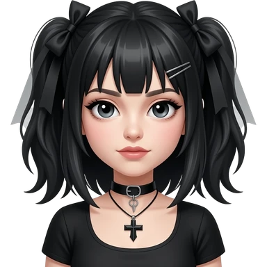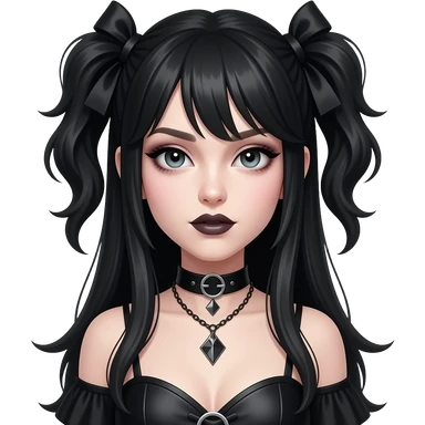 Goth girl with half of her hair shaved, the unshaved part is really long and wavy and blue eyes she has a spiderw3d tattoo on her chest and a small cross tattoo on her temper emoji