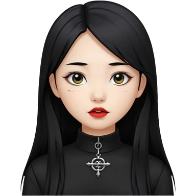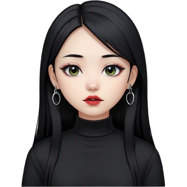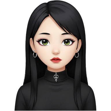 goth Asian girl, straight long black hair, lip piercing, black mock neck shirt emoji