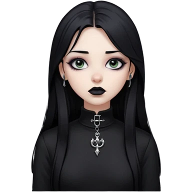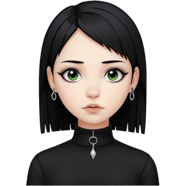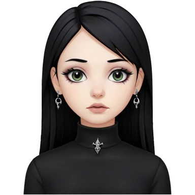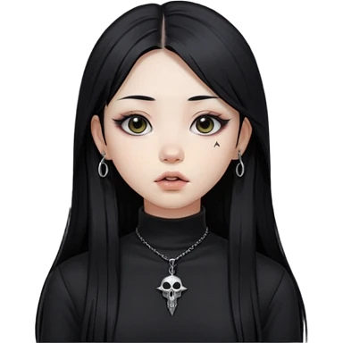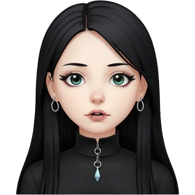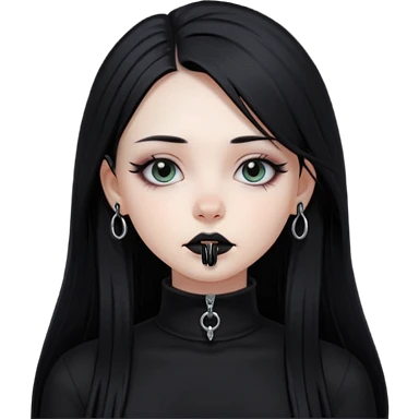 goth girl, straight long black hair, vertical labret lip piercing, black mock neck shirt emoji
