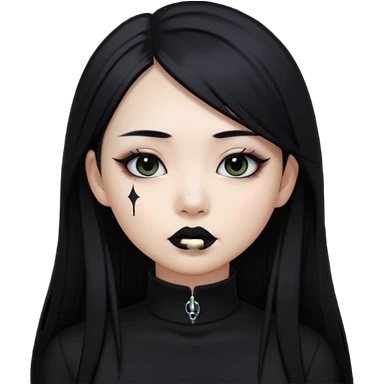 goth Asian girl, straight long black hair, vertical labret lip piercing, black mock neck shirt emoji