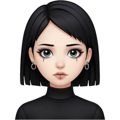 goth girl, straight black hair, verticals labret piercing, black mock neck shirt emoji