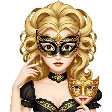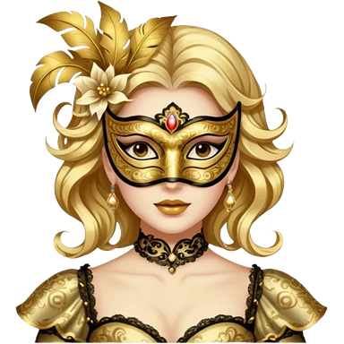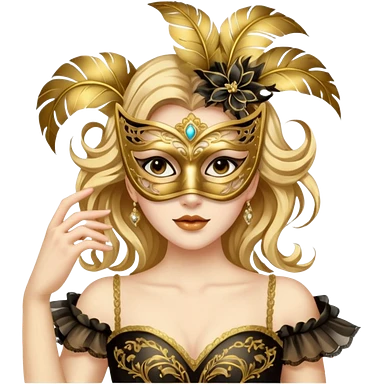A woman in an ornate gold masquerade mask and elegant outfit, holding the mask delicately. emoji