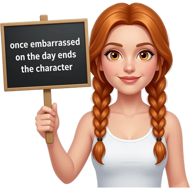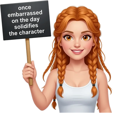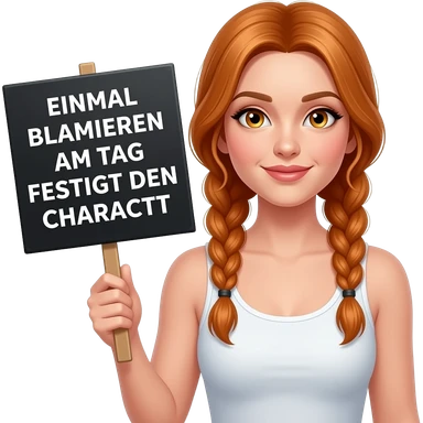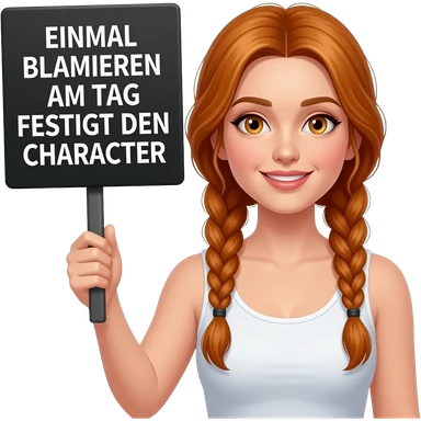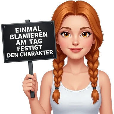 sexy girl with long ginger braids and ginger eyes wearing a white tanktop holds a black sign with EINMAL BLAMIEREN AM TAG FESTIGT DEN CHARAKTER written on it emoji