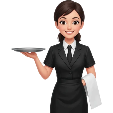 waitress with black hair and a food plate with a black tshirt and ª jeans apron. with a bigger plate and the plate with a cover emoji
