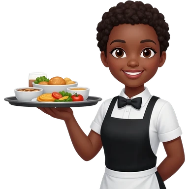 waitress woman with Dark hair and with skin, with meal tray, emoji emoji