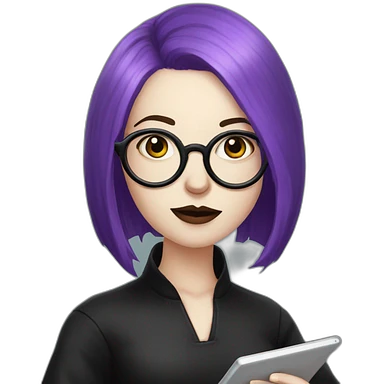 goth woman with long side parted purple hair and oval glasses, pale skin, taking notes on a tablet emoji