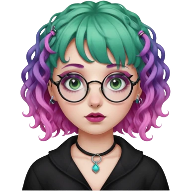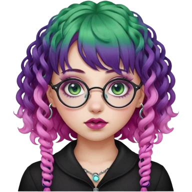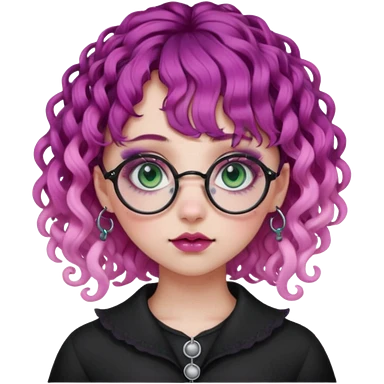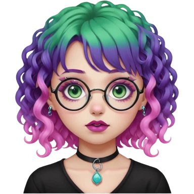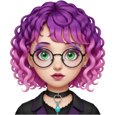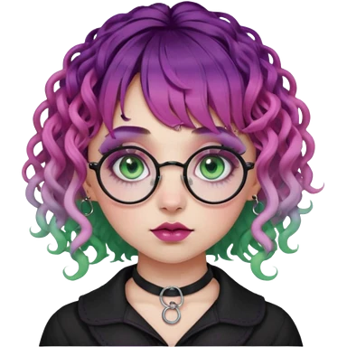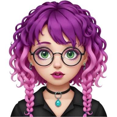. Gothic girl with pink to violet ombré ringlet curly hair, bangs round glasses, septum piercing, nostril piercing, almond eyes, blueish green eyes,heavy eyeliner, emoji