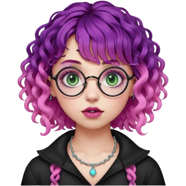 . Gothic girl with pink to violet ombré hair with pink on top, ringlet curly hair, bangs round glasses, septum piercing, nostril piercing, almond eyes, blueish green eyes,heavy eyeliner, emoji