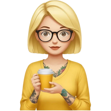 gözlük takan, dövmeli ve elinde kahve tutan, yaz kıyafetli bir kadın. kıyafeti sarı olsun emoji