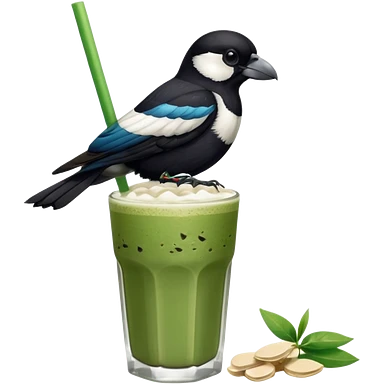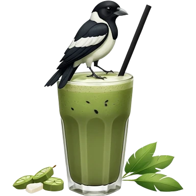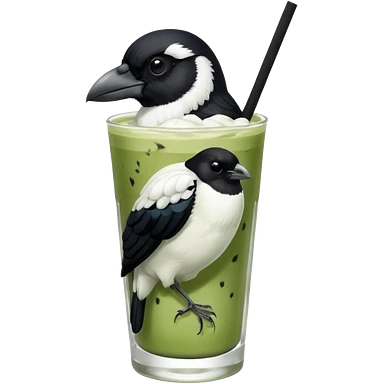 It’s an Australien Magpie (just black and white feathers) sitting on an iced matcha latte on the edge of the glass. It has green matcha on its beak indicating it drank. The iced matxha latte is in a see through glass and white from the oat milk on the bottom and green on top… one straw and ice cubes emoji