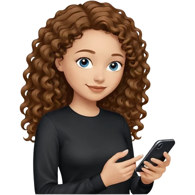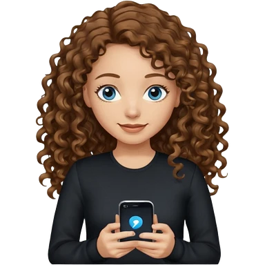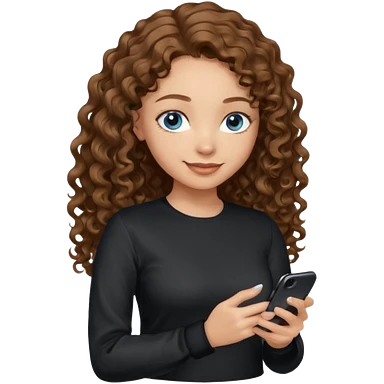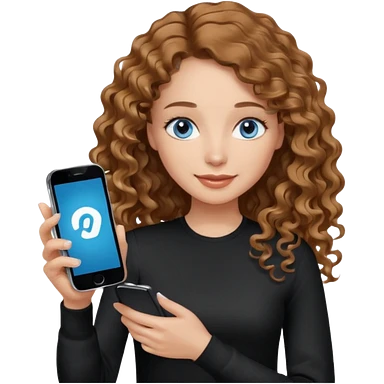 generate a pretty woman with blue eyes, light skin and medium brown long wavy/curly shiny hair holding a phone she is looking at the phone while looking down at the screen. she is wearing an ALL black long sleeve emoji