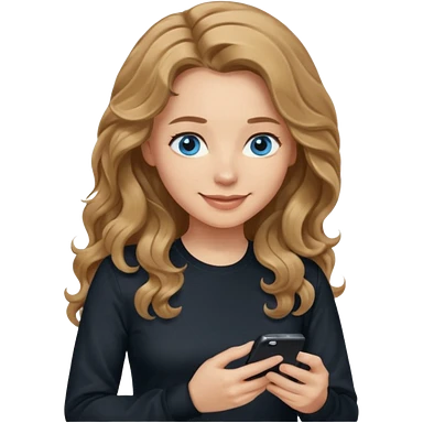 generate a pretty woman with blue eyes, light skin and medium brown long and really wavy shiny hair holding a phone she is looking at the phone while looking down at the screen. she is wearing an ALL black long sleeve. she is smiling emoji