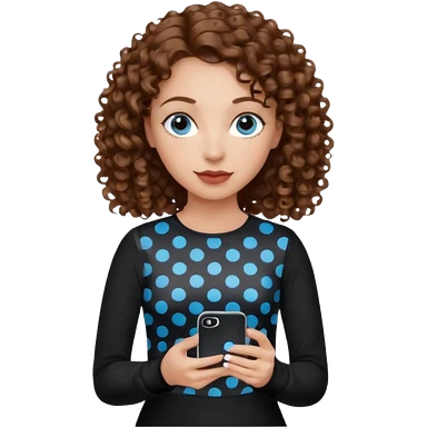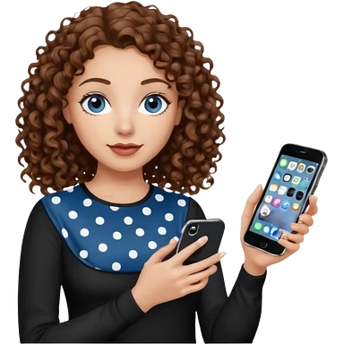 generate a pretty woman with blue eyes, light skin and medium brown curly shiny hair holding an iphone with a black and white polka dot case. she is looking at the phone and holding it in her hand. she is wearing a black long sleeve emoji