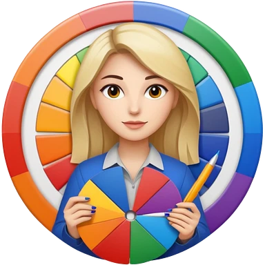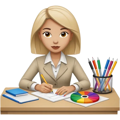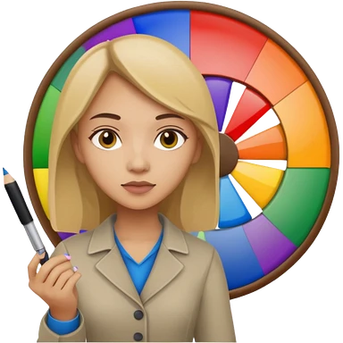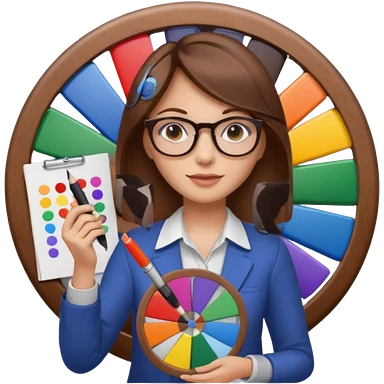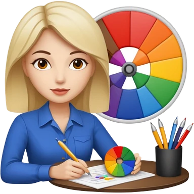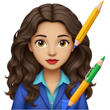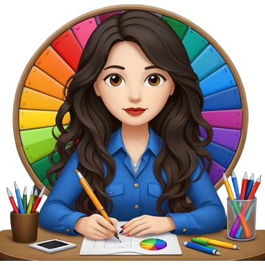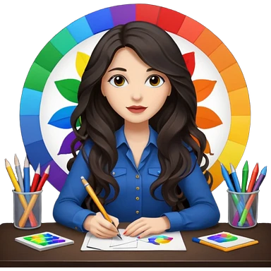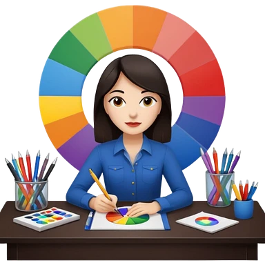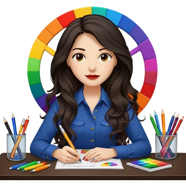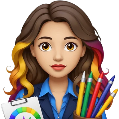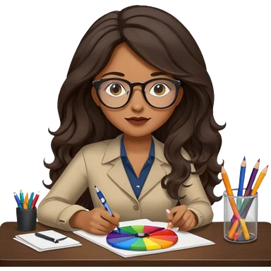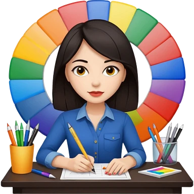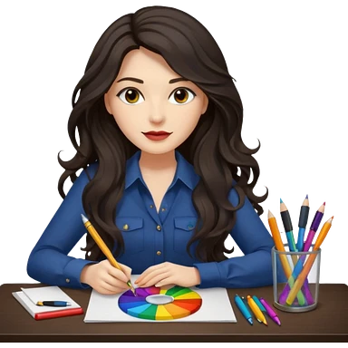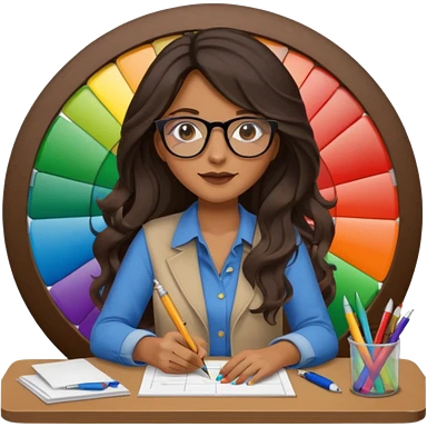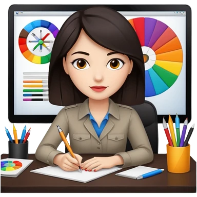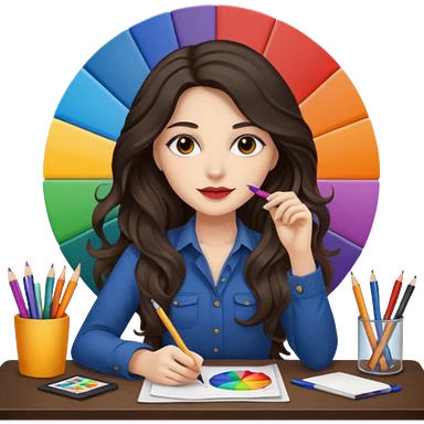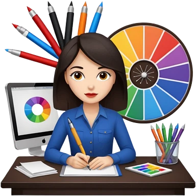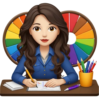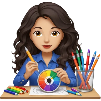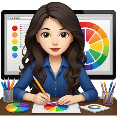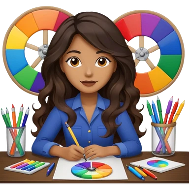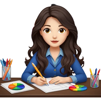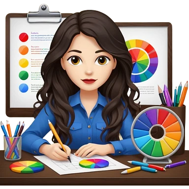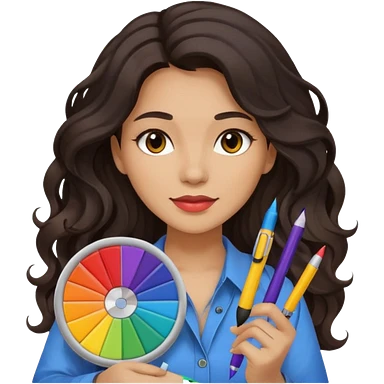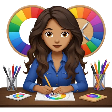 female dark wavy long hair graphic designer , color wheel, pens, papers emoji