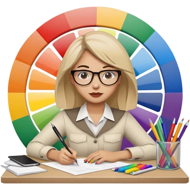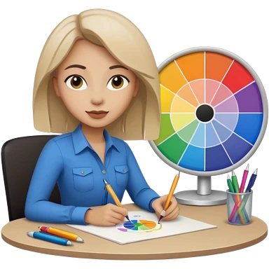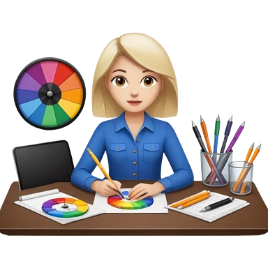female graphic designer , color wheel, pens, papers , desktop emoji