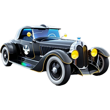 luxurious ghostly sporty antique electric Darth Vader’s Batman-armored 1926 black graphite colored enclosed twin seat town coupe Batmobile with horizontal holographic 3d stars painted on the body sides and neon underglow emoji