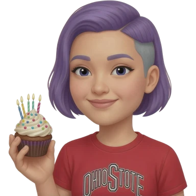 jewish asian woman with short shaved on one side purple and gray hair in ohio state shirt holding cupcake with a birthday cancle emoji