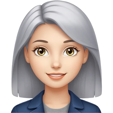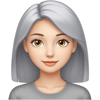 A girl with fair skin, blue eyes, dark brown hair, smiling, she's wearing a gray sweater emoji