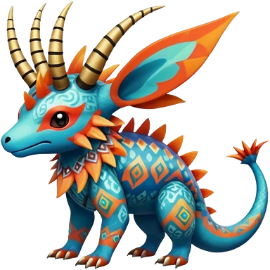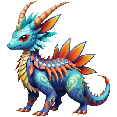 Colorful Exotic tropical Pokémon-Fakémon-hybrid-creature (full body) with tribal intricate splash-markings and patterns and furs and scales and spikes and fins and horns emoji