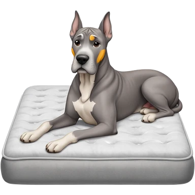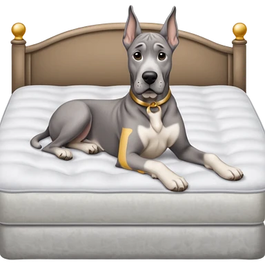 Gray Great Dane on king size mattress floppy ears white mattress emoji