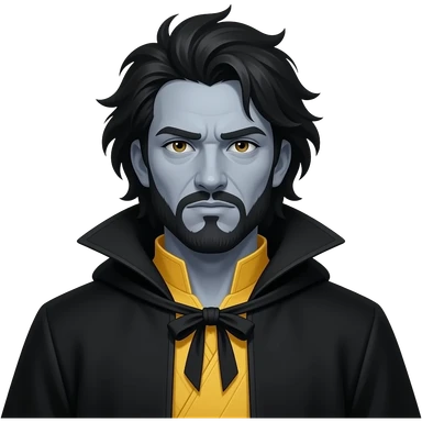 a Gray skined man with black crazy hair with a black cloke and yellow peuples emoji