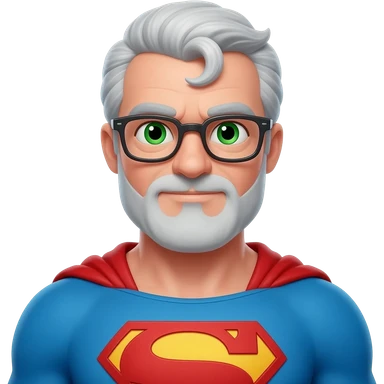 gray hair, no beard, glasses, green eyes, superman stance and outfit emoji