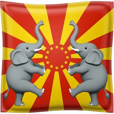 Flat emoji vector flag, square: red–yellow–red stripes; center red circle with radial floral lines + star ring; mirrored gray elephants inward, raised leg, curved trunk, white tusks; simple, bold, no gradients/shadows. emoji