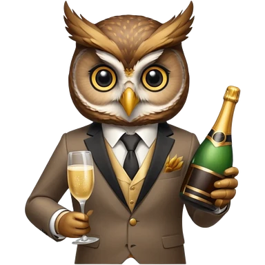 owl wearing suit, holding champagne bottle emoji