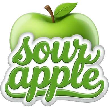 green calligraphic letters with a white border spelling "sourapple" inside a lineart of a green apple emoji