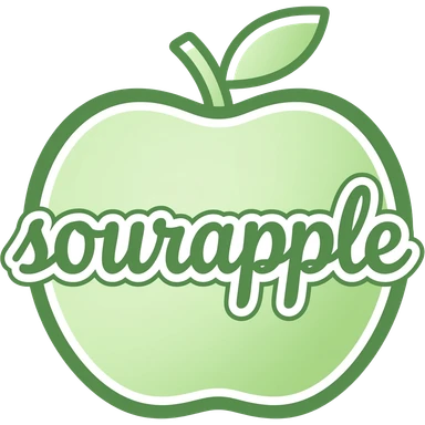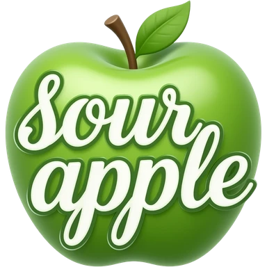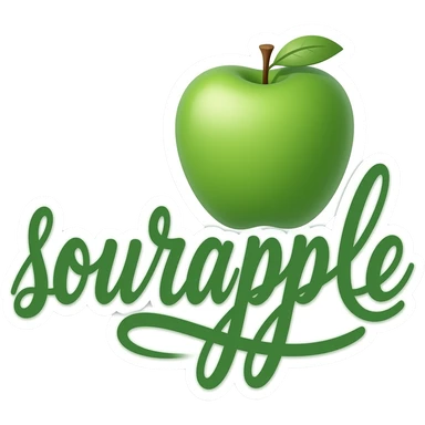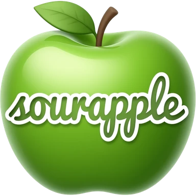 green calligraphic letters with a white border spelling "sourapple" inside a border of a green apple emoji