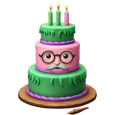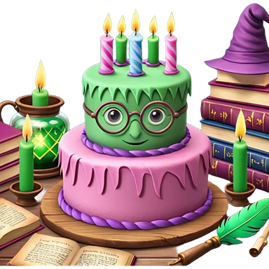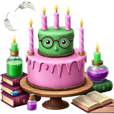 Harry Potter themed pink birthday cake with green 'Happy Birthday Harry' icing, surrounded by wizard books, candles, potion bottles, feathers, and glasses on wooden table, magical atmosphere." emoji