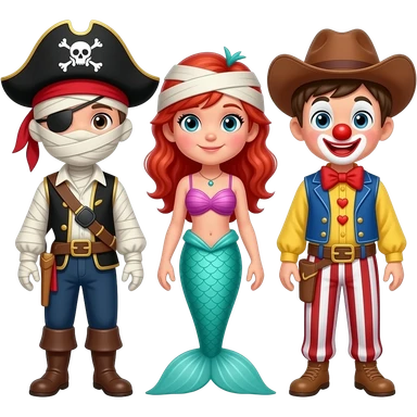 Boy wearing a mummy costume boy wearing a pirate costume boy wearing mermaid costume boy wearing cowboy costume boy wearing clown costume emoji