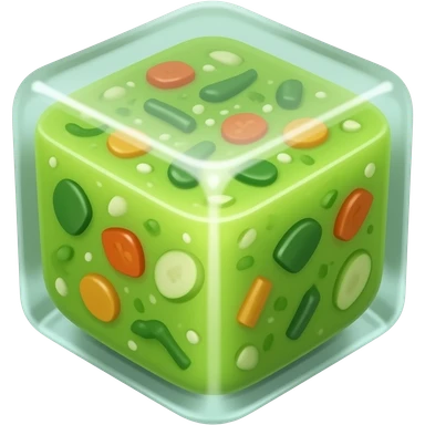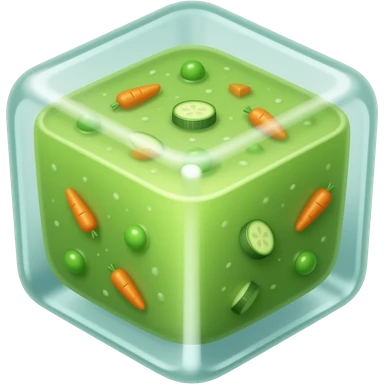 A Soup but frozen in a cube. Blend the Cube with the soup. Add some veggies. The ice cube should be the soup and there should be no ceramic. Get the outwards of the icecube to match the color of the inner soup content. Green toned emoji