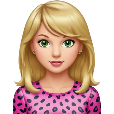 Long haired with bangs that frame her face, Green eyed, smiling Taylor Swift wearing a pink leopard print dress with long golden blond hair emoji
