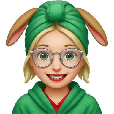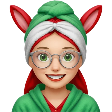 Asian woman wearing a green towel in her head with a broken glasses on her face in red pajamas her smile with rabbit front teeth and the cloth should be red emoji