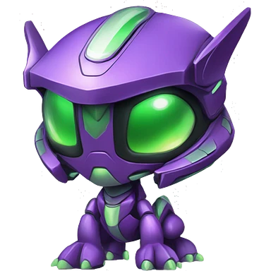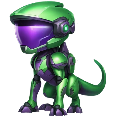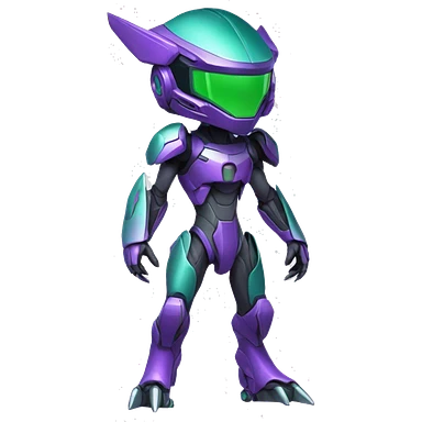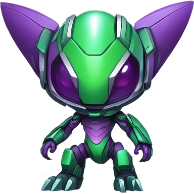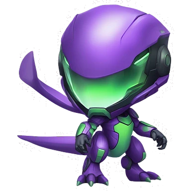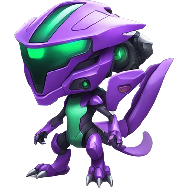 a chibi-style purple-green Genesect-Raptor-Fakémon—hybrid with a futuristic visor-helmet full body emoji