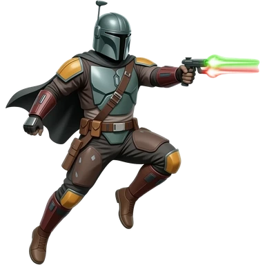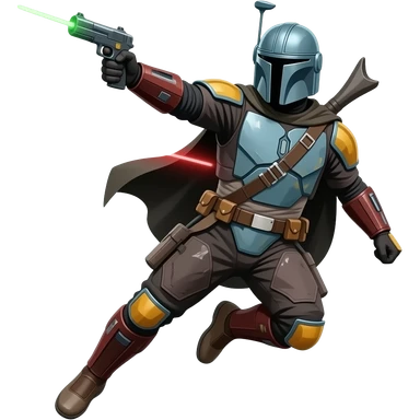 Mandalorian jump in air, diagonal composition, dynamic action scane, shooting (Green and red colors) emoji